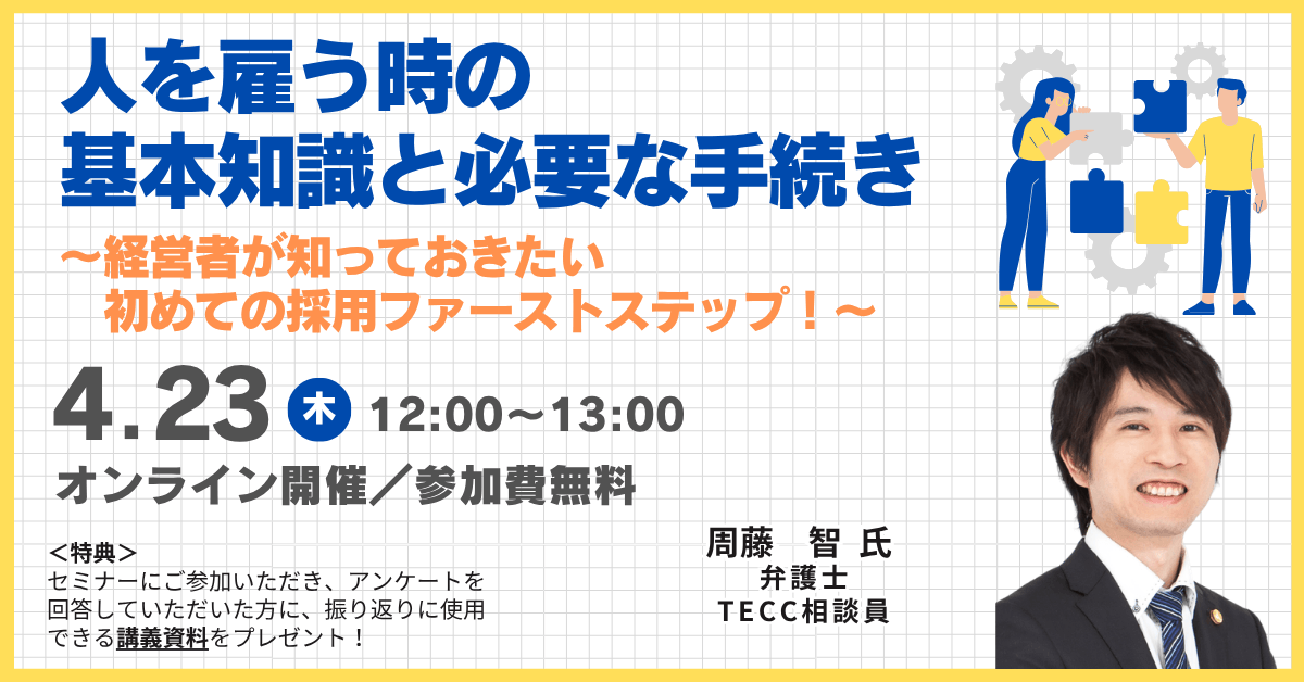 アルバイトやパート社員を雇うとき、知人をビジネスパートナーとするときなど、実際に雇用するタイミングで何とかしようとすると後々トラブルのもとになります。今回は雇用する前に知っておきたい労務知識を社会保険労務士より、採用において重要な4箇条を弁護士より解説いたします。正しい雇用計画を立てて、会社を強く成長させていきましょう。